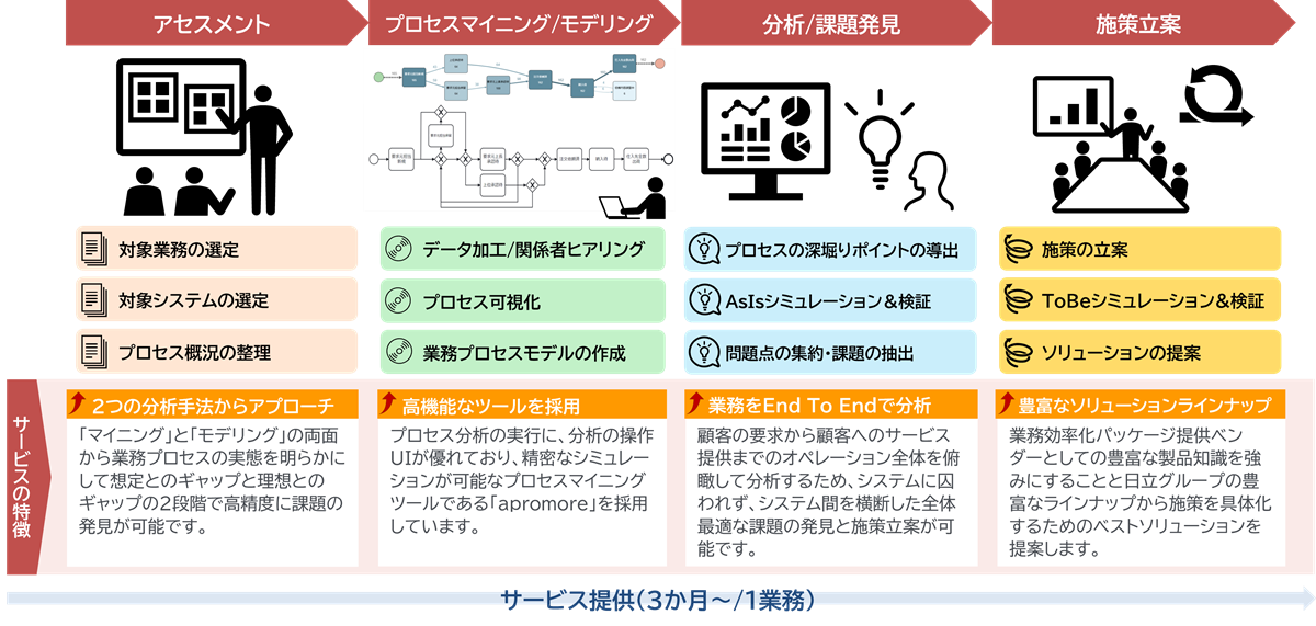 日立ソリューションズ東日本は、これらの課題解決のため、お客様のオペレーションをプロセス起点で分析して課題を定量的に可視化、施策の立案から施策を具体化するソリューションを提案し、主経営層や企画部門のお客様の意思決定を支援する業務分析サービスの提供を開始しました。サービスの全体像を以下の通り示します。