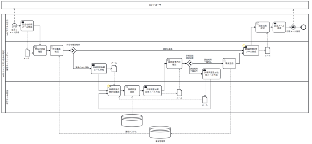 さらに、プロセスマイニングで可視化したプロセスを起点に、AsIsモデルを作成することで、システムでは把握できていない作業の発見や、想定されていた業務オペレーションとのギャップを明らかにする強みがあります。モデル図(BPMN)のイメージを以下の通り示します。