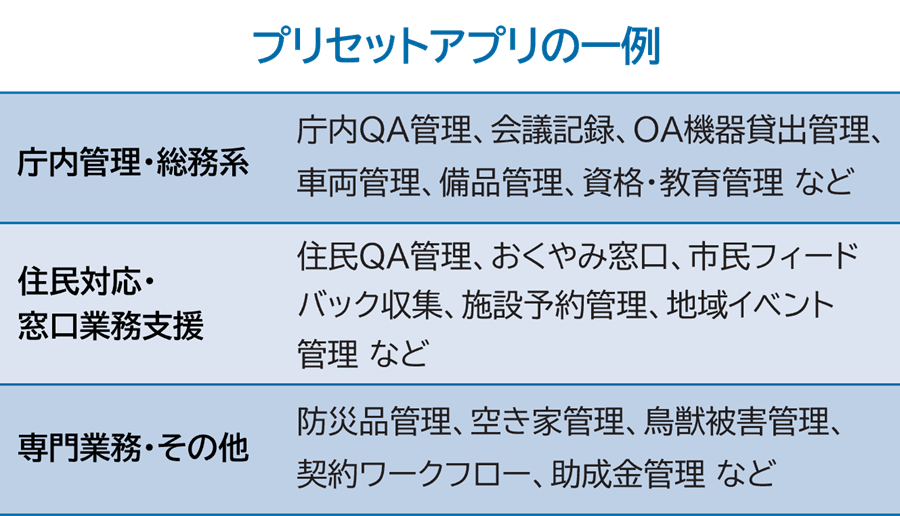 AppSQUARE 自治体向けソリューションは、自治体業務に特化して設計された「専用アプリ(プリセットアプリ)」です。