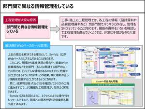 工事・施工業の工程管理が大変な4つの原因と、SynViz S2を活用した解決策についてご紹介しています。 |