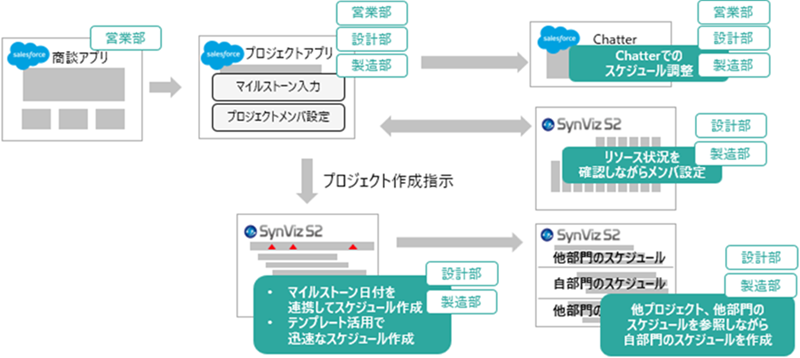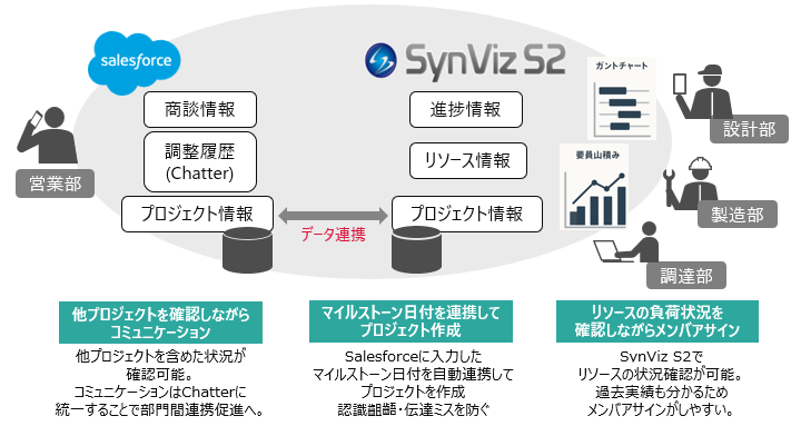 SynViz S2 for Salesforceでは、商談時から各部門間でスムーズな連携・調整が可能になります。
