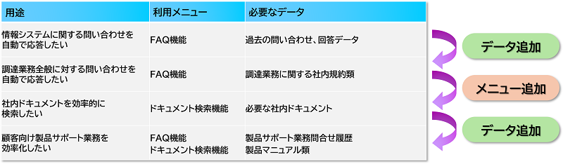 • 旅費精算、経費精算、調達、情報機器やシステムのトラブルといった様々な問い合わせに対して、FAQや過去の問い合わせデータを利用して