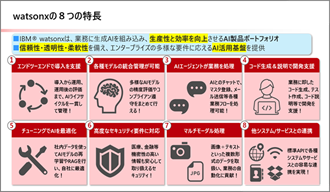 この資料では、ビジネスのためのAI活用を加速するビジネスAIプラットフォーム「watsonx」の8つの特長についてご紹介しています。
