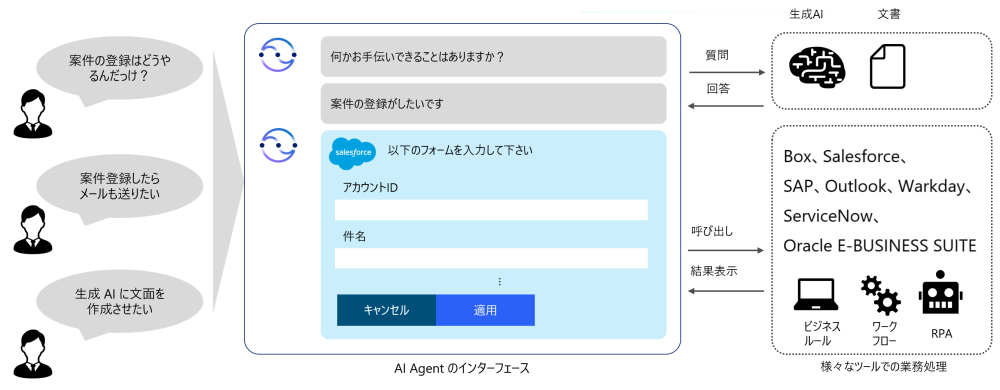 業務ユーザーが自然言語で「やりたいこと」を入力するだけで、案件登録、メール送信、文書生成などの複数処理を組み合わせたフローを実行できます。