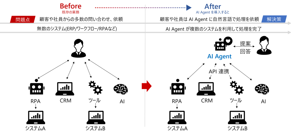 AIエージェントは、ERP、CRM、RPA、業務システムなど、複数のシステムをAPI連携で利用しながら処理を完了します。