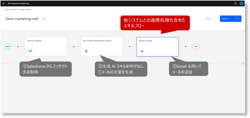 事前定義できない、状況に応じて対応が変わる処理については、watsonx Orchestrateが次に実行すべきスキルの候補を提案してくれます。